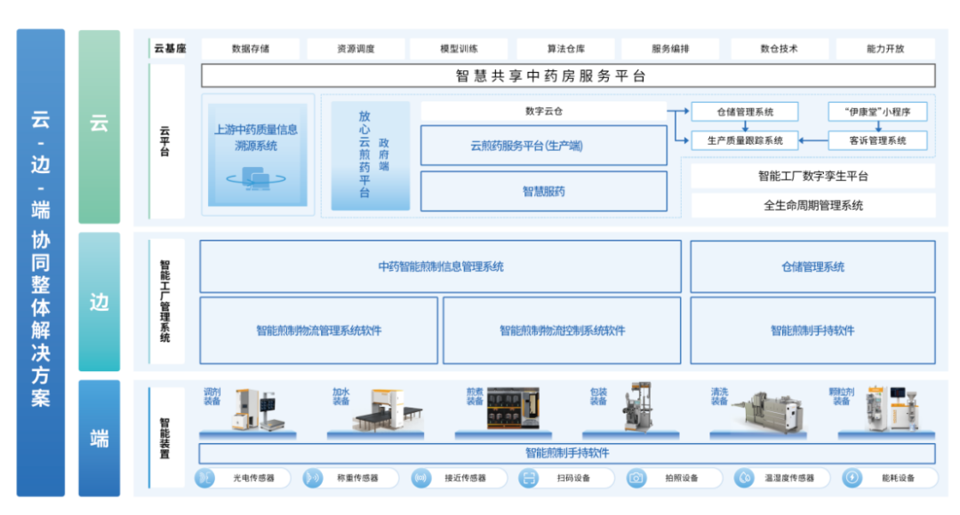![]() 智慧共享中药房的另一核心价值在于通过数字化技术打破 “信息黑箱”。厚达智能构建的 “云边端” 架构,让中药服务从“黑箱”变为 “透明工厂”: 云端:整合饮片溯源数据(产地、批号、质检报告等)与煎制过程数据(调剂精度、调剂照片、煎煮时间、煎煮温度曲线等),实现全程可溯源。 边端:开发多套软件系统,管理仓库、生产、财务等业务流程。 终端:智能加水、调剂、煎煮等设备作为执行系统,实时采集运行数据。