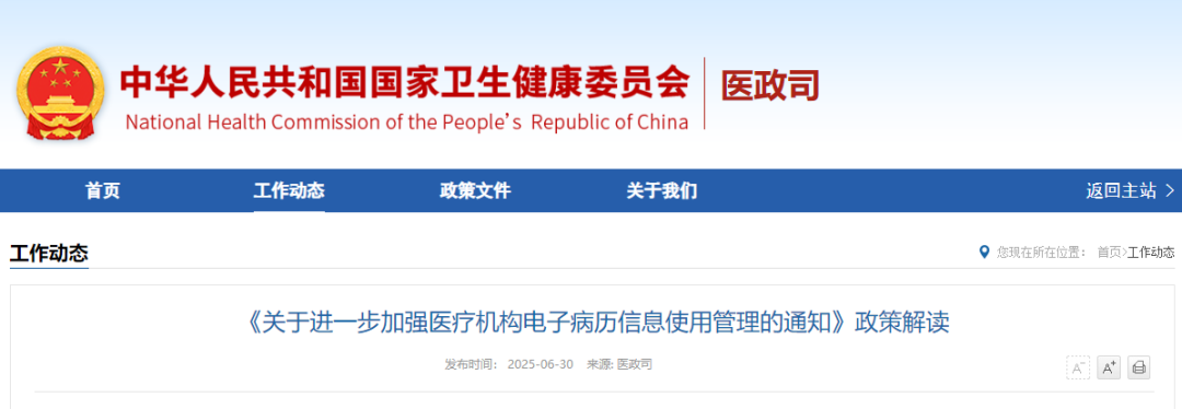 6月30日,国家卫生健康委会同国家中医药局、国家疾控局制定《关于进一步加强医疗机构电子病历信息使用管理的通知》,旨在保障患者医疗信息和医疗质量安全。